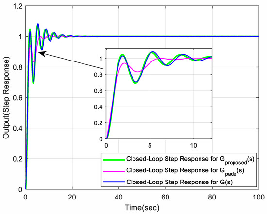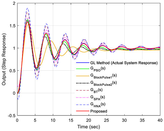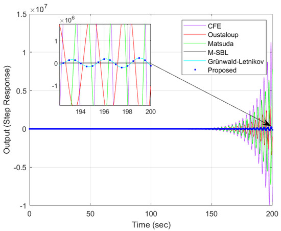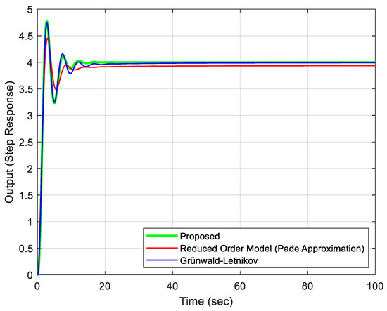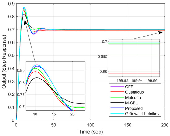 The integer-order approximate transfer function is computed by the proposed method, and the approximate transfer function is shown in Equation (52). Unit step response of the transfer functions is computed by the literature [35,47,48,49], and the proposed methods are superimposed in Figure 9.
