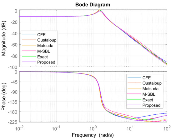 The proposed method offers a 5th-order approximation. For the accuracy of the comparison, the transfer function of order 5 or more is chosen in [48], which is given in Equation (54).