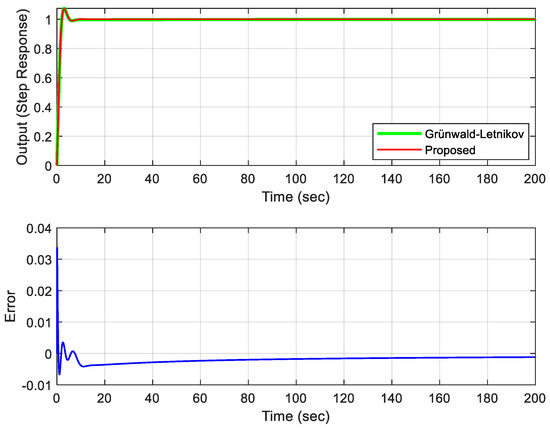 The unit step response and error plot of and are plotted in Figure 8 for the performance analysis of the proposed method. The error curve was obtained, according to the GL method. As is seen in Figure 8, the error margin of the proposed method is almost zero. Only at the first moment there is a maximum error margin of 0.034. It is shown that a low-order integer approximation is obtained due to the use of the proposed method. It also has a very low margin of error. This example also shows that very complex fractional-order transfer functions, such as , can be directly converted as a low-order integer-order transfer function by using the proposed method. The proposed method is also a helpful tool for applying classical control theory techniques to fractional-order control systems.