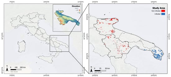 The areas occupied by infected and uninfected plants are in different locations, neither overlapping nor neighboring. The selection of both types of areas (infected and uninfected) was driven by the fact that they are quite homogeneous from the topographical (as shown in the inset of Figure 1) and climatic points of view. These areas are quite flat, especially in the SE part of Apulia (where infected olive trees have been detected) and in the NE part of Apulia and along the Ionian coast of Basilicata (where no traces of Xylella fastidiosa have been found so far), with hilly topographic features in the NE part of Basilicata, characterized by a distinctly Mediterranean climate with cold winters and hot and dry long summers.