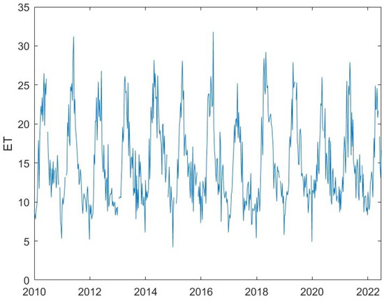 Since the effect of the infection by Xylella fastidiosa in olive trees is the rapid branch desiccation [25], we analyzed the Moderate Resolution Imaging Spectroradiometer (MODIS) evapotranspiration (ET) data that are able to monitor the water status of plants and, thus, to detect signs of the presence of disease. The data, which have 500 m spatial resolution and are eight-day sampled, are freely available online (https://lpdaac.usgs.gov) and in the Google Earth Engine (GEE) cloud database. The ET is calculated, summing up soil evaporation (), canopy evaporation (), and canopy transpiration ():