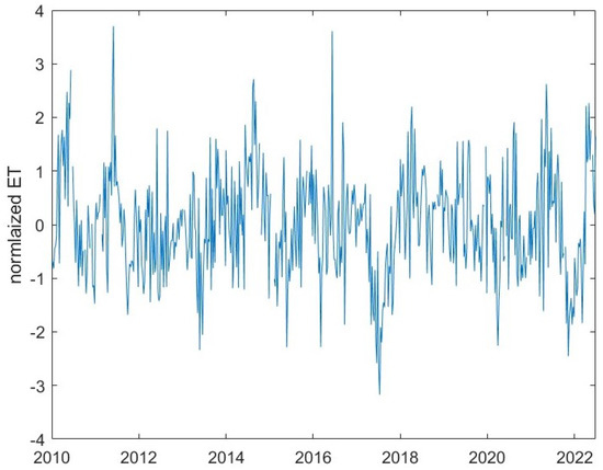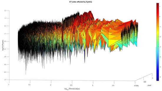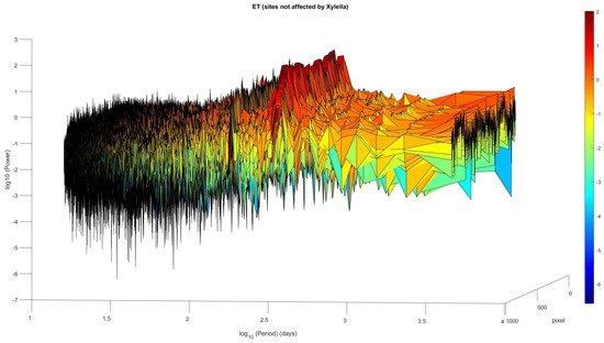 The ET time series are characterized by oscillating variability, as shown by Figure 2, which represents, as an example, the time variation of ET of a pixel of infected area. Figure 3 and Figure 4 show the periodogram and the heat map of the pixel time series of the infected and not-infected areas; all pixels are modulated by annual and sub-annual (6, 4, and 3 months) cycles that represent the phenological cycles of vegetation correlated with the meteo-climatic oscillations. In order to investigate the inner time dynamics of vegetation not driven by the meteo-climatic oscillations, we filtered them out and analyzed the residuals. Figure 5 shows the normalized residual after the spectral filtering of the pixel time series shown in Figure 2.