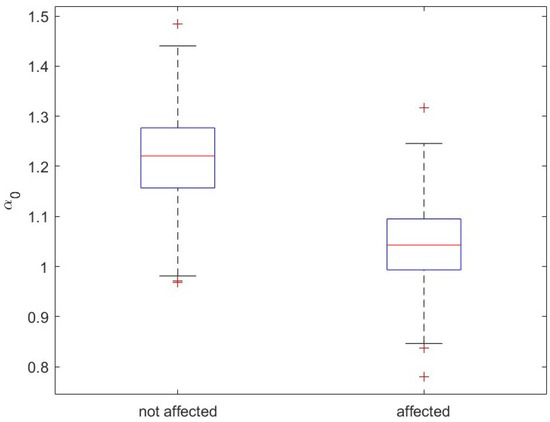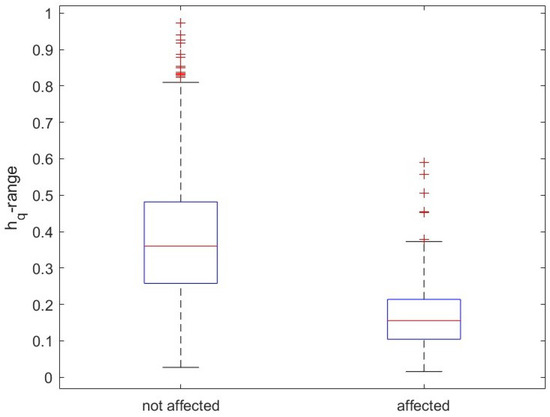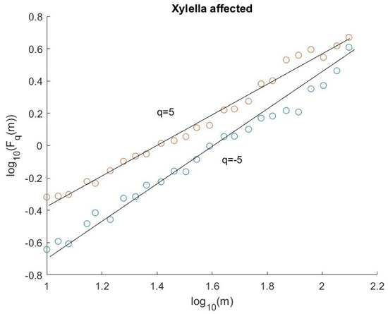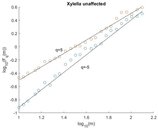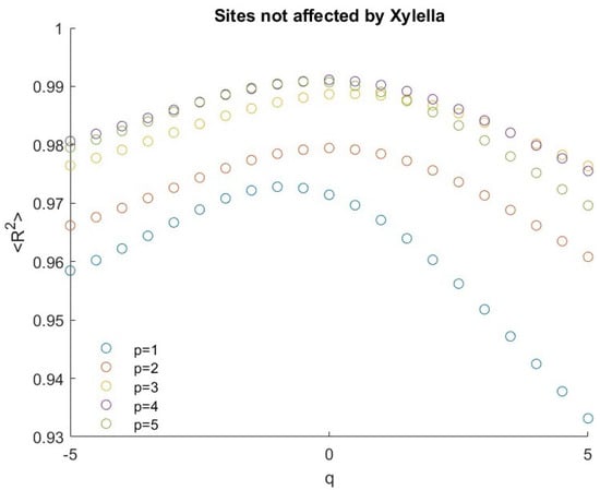 We applied the MFDFA to each residual pixel time series, varying the moment order q from −5 to 5 and the scale m from 10 to 1/4 of the length of the series. The gaps were eliminated by simply stitching together the two neighbors [28]. In order to select the optimum degree of the detrending polynomial, we calculated the fluctuation functions for each q for detrending polynomial degree . For each we computed the coefficient of determination of the linear fit of and analyzed the multifractality of those pixels, whose for any q, while those with for at least one value of q were discarded. Figure 6 and Figure 7 show the variation of (average of over all the selected pixels) versus q, for for the infected and not-infected areas, respectively; we can see that is relatively larger for for the areas not affected by Xylella fastidiosa, while it is the largest for for the affected areas. Thus, we analyzed the multifractality with and for the Xylella-affected and Xylella-not-affected areas, respectively. Moreover, with these values of p, the number of selected pixels is 989/996 for the infected area and 1005/1023 for the not-infected area. As an example, Figure 8 and Figure 9 show the fluctuation functions for and of two pixels, the first for an infected site and the other for an uninfected site. Figure 10, Figure 11 and Figure 12 show the boxplots of the multifractal parameters: -range, W, and .