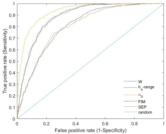 We analyzed the receiver operating characteristic (ROC) curve of each of the three multifractal (-range, W, and ) and of the two informational (FIM and ) parameters to test their performance in discriminating between infected and not-infected olive trees. The ROC curves are well known to test the performance of binary classifiers [24]. The ROC curve shows the relationship between the TPr and the FPr. For each of the five parameters, we constructed the corresponding ROC curve by varying a threshold. Focusing, for instance, on the parameter W that is the width of the multifractal spectrum, there are 989 values for infected pixels (with a mean ) and 1005 for uninfected pixels (with a mean ). W ranges from the minimum 0.1410 to the maximum 1.4920 (see Table 1). The threshold ranges from the minimum to the maximum of all the values of W. After sorting all values of W in increasing order and fixing a threshold F, since , a TP is a value of infected pixel below F, an FP is a value of uninfected pixel below F, an FN is a value of infected pixel above F, and a TN is a value of uninfected pixel above F. Thus, for this value F of the threshold, the TPr and the FPr can be calculated and one point of the ROC curve is obtained. Changing the value of the threshold among all those between the minimum and the maximum and repeating the same procedure, the entire ROC curve is obtained. After cosntructing the ROC curve, the value of the optimal threshold corresponds to the point of the ROC curve that is the closest to (0,1).