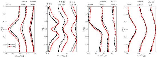 To verify the CFD simulation results, the velocity distribution simulated at the inflow velocity of 20 m/s was compared with that of the experiment [29]. When comparing, we considered the mean component and the pulsing component as follows: