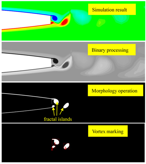 In fractal geometry, the calculation methods of fractal dimension are abundant, and include the classical methods: self-similarity dimension and box number dimension. Additionally, classic methods such as the root mean square method, and area perimeter method have been developed. Figure 4 is the fractal research process of vortex shedding at the trailing edge of the hydrofoil, and the four steps are as follows: obtaining simulation results, binary processing, morphology operation and vortex marking. In the morphology operation process, irregular island shapes often appear, which are called fractal islands. The shedding Karman vortex often appears in a circular or near-circular shape, and this type of fractal island shape is suitable for calculating the fractal dimension of the vortex using the area perimeter method. Based on this feature analysis, the area perimeter method is used to analyze the fractal characteristics of a turbulent Karman vortex at the trailing edge of the hydrofoil in this study.