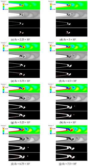 In Figure 5, the fractal process of turbulent Karman vortex at the trailing edge of the hydrofoil at different Reynolds number ranges from 7.5 × 106 to 7.5 × 107 is displayed. When the value of the Reynolds number was small, the vortex had a smaller scale and lower intensity, and the morphological operation eliminated most of the vortex structure. With the further increase in the Reynolds number, the size and strength of the vortex core at the trailing edge of the hydrofoil increased, and the number and area of fractal islands formed after morphological treatment further increased. The fractal process at each Reynolds number proceeded smoothly, which laid the foundation for the following research.