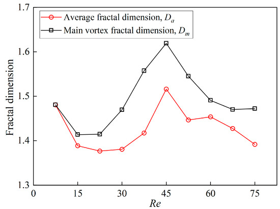 Table 1 is the fractal dimension of perimeter of the Karman vortex at every Reynolds number calculated according to Equation (7). When the area of one vortex is the largest one for the same Reynolds number condition, then this vortex is defined as a main vortex. As shown in Figure 6, since Re = 7.5 × 106, there is only one vortex core, so its main fractal dimension is equal to the average fractal dimension. Except for this Re value, the main fractal dimension, Dm, at all Reynolds numbers is greater than the average fractal dimension, Da. The fractal dimension at each Reynolds number is between 1.41 and 1.62, and the average fractal dimension is between 1.38 and 1.52. According to the statistical results, at the same Reynolds number, the size of the main vortex is the largest, and Da is less than Dm. That is to say, fractal dimension can be used to express the size and shape of a vortex.