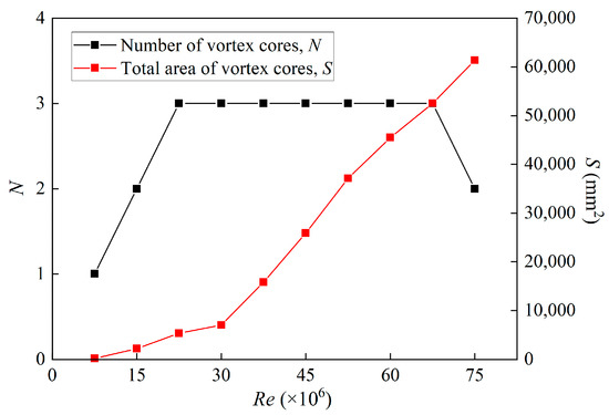 However, when the Reynolds number further increases, due to the further increase in the strength of the previously appearing vortex cores, the phenomenon of vortex cores being connected appears, so the number of main vortex cores decreases to two. The total area of the vortex core increases with the increase in the Reynolds number, and it is the same at each Reynolds number.