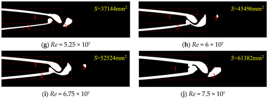 Figure 8 is a comparison chart of the total area of vortex cores at each Reynolds number. It shows that when the Reynolds number increases, the total area of the vortex core gradually increases. In the data comparison, the Reynolds number is greater than 3 × 107, and the growth rate of the total area of the vortex core increases significantly. It can be seen that the complexity of flow patterns increases significantly due to the increase in the Reynolds number, resulting in the first pair of shedding vortices at the trailing edge of the hydrofoil forming long strip wakes on both sides of the trailing edge of the hydrofoil, which are extracted together during the fractal feature extraction of the vorticity map. However, in general, with the increase in the Reynolds number, the total area of the vortex core of the turbulent Karman vortex at the trailing edge of the hydrofoil gradually increases.