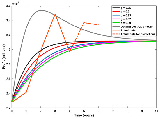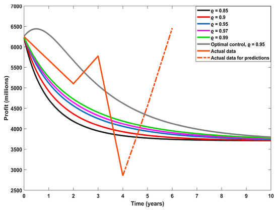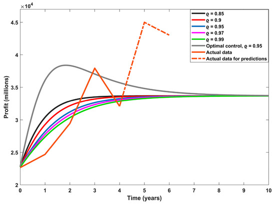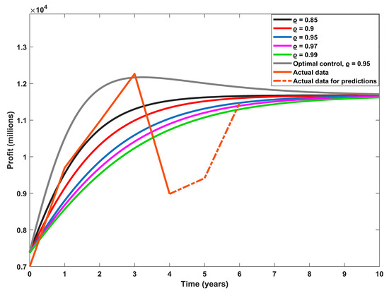 As is evident in all types of data for the four categories of banks, in the fifth year under study, 2020, the COVID-19 pandemic had a severe impact, causing a decrease in the profits of these banks and decreasing the efficiency of dynamic modeling. We therefore aimed to solve this problem: we developed the modeling process by presenting the second-fractional-order model by adding a specific optimal control function with a maximum value of the reinvestment varying from one category to another. The aim was to control the profits in order to absorb the occurrence of crises and so that the profits become as if they were without reinvestment in the absence of crises during a certain time interval. The proposed controlled dynamic model is solved numerically using the predefined Adams–Bashford scheme. We run the dynamic model with a fractional order parameter value of 0.95, as it gives intermediate accuracy for the four categories in the previously proposed model without control. The optimally controlled profits for the four categories are presented in Figure 1, Figure 2, Figure 3 and Figure 4. As presented, the controlling function has a strong impact on maximizing the banks’ profits.