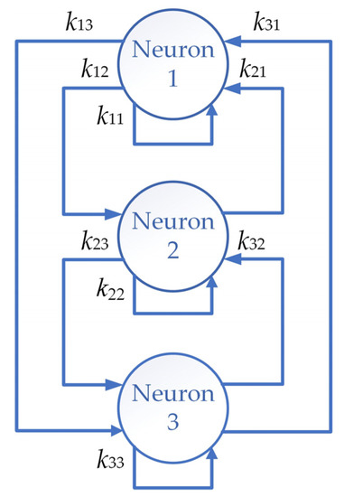 xi (i = 1, 2, 3) indicates the status variable associated with the membrane potential of the i-th neuron, kij represents the G × G matrix of synaptic weights, and tanh(xj) (j = 1, 2, 3) denotes the activation function responsible for mapping its input to the output on a neuron that is nonlinear. The topology is shown in Figure 1 and the matrix can be expressed as