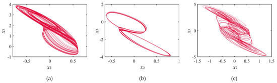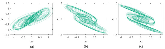 Phase portraits of the system. (a) x1-x2 plane; (b) x1-x3 plane; (c) x2-x3 plane.