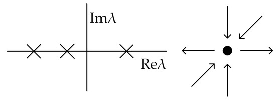According to Equation (25), all three eigenvalues are real roots, and λ1 < 0, λ2 < 0, and λ3 > 0. λ1 is a positive real root corresponding to an unstable solution, while λ2 and λ3 are two negative real roots corresponding to two stable solutions. As shown in Figure 3, this is a saddle point with an unstable manifold and the confluence of two stable manifolds for indicator 2.