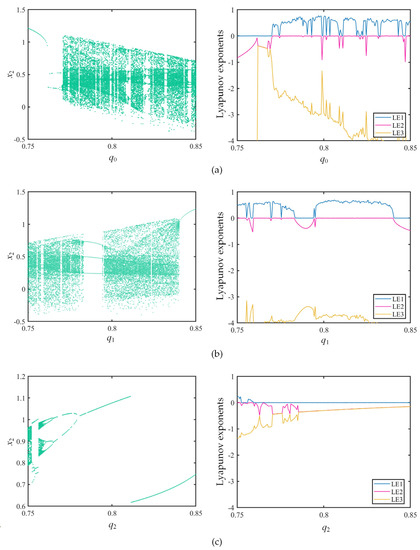 The bifurcation diagram and LEs when the incommensurate fractional order changes. (a) q0 ∈ (0.75, 0.85); (b) q1 ∈ (0.75, 0.85); (c) q2 ∈ (0.75, 0.85).