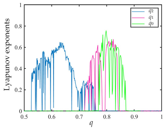 Observe that q0 in Figure 4a enters chaos from 0.772, with occasional brief periodic states in a continuous chaotic state. q1 in Figure 4b is already in a chaotic state at 0.75; it has a longer period-3 window at 0.782, enters chaos again at 0.795 via a tangent bifurcation, and then changes back to a periodic state at 0.84. q2 in Figure 4c undergoes a brief chaotic state and then enters the periodic state through an inverse multiplicative periodic bifurcation. As shown in Figure 5, the max Lyapunov diagram for qi is (i = 1, 2, 3), unfolding the range of local instability of chaotic attractors caused by each order.