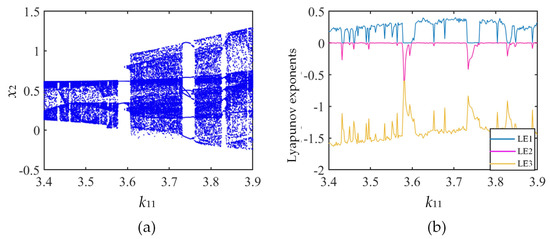 The dynamical behaviors with k11 vary. (a) Diagram of bifurcation; (b) Lyapunov exponents of the system.