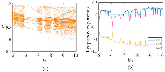 The dynamical behaviors with k31 vary. (a) Diagram of bifurcation; (b) Lyapunov exponents of the system.