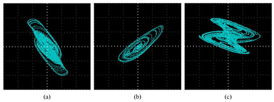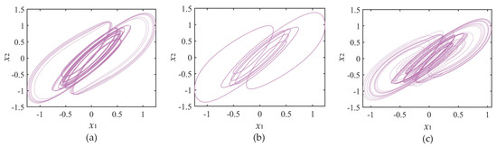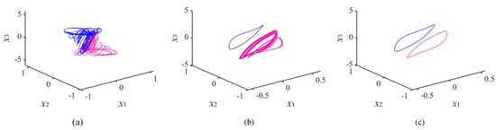 The coexistence of incommensurate fractional orders was observed by adjusting the order of the system. The setting was k11 = 3.7, k23 = 0.8, k31 = −8, and k33 = 1. The attractor is blue when the initial value x0 = (1, 1, 1) and pink when the initial value x0 = (1, −5, −5); incommensurate order q0 = 0.91, q1 = 0.89, and q2 = 0.8. The coexistence attractor phase diagram is shown in Figure 11a. By fixing q0 = 0.91 and q2 = 0.8 and changing the value of q1 so that it is equal to 0.88 and 0.86, the different types of coexistence attractors are plotted in Figure 11b,c.