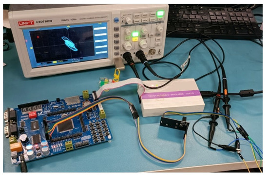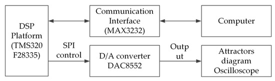 The hardware implementation of the chaotic system is the key step in its application in engineering practice. DSP becomes the core of the electronic system with its programmability and easy implementation. This part uses DSP to obtain the chaotic signal of the system based on a typical TMS320F28335 DSP chip to study the implementation of FOHNN. The DSP hardware block diagram to realize the incommensurate FOHNN system is shown in Figure 12.