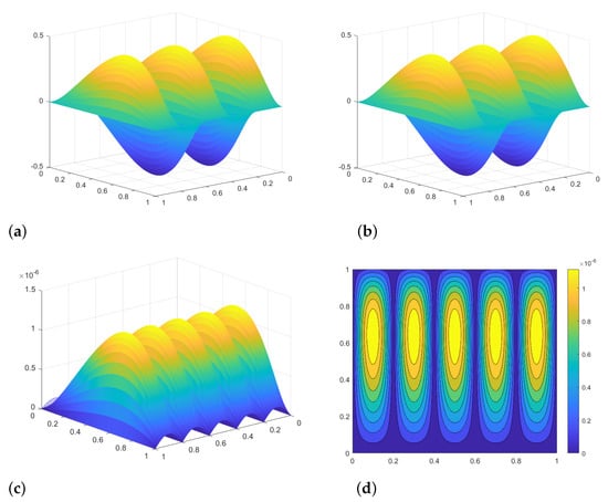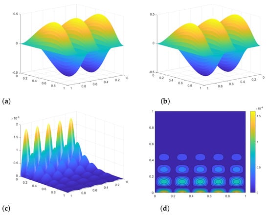 Example 3. For the last test, we choose . The force term is the following:where the corresponding initial term is and the exact solution is . Let