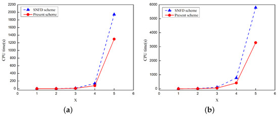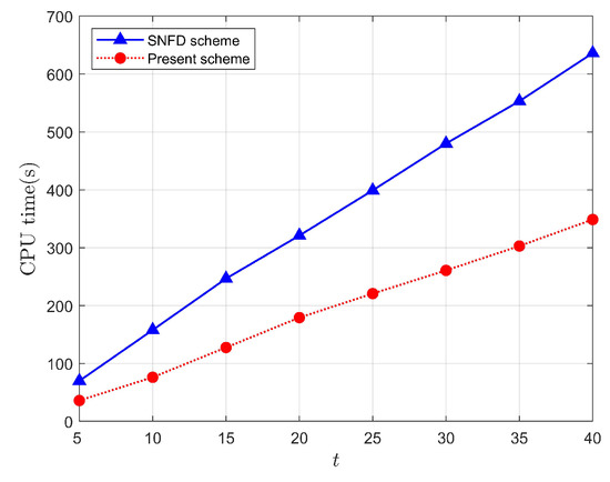 Figure 6. Comparison of computation times of the SNFD scheme in [22] with present scheme at long time under h = 1 / 10 , τ F = 1 / 100 .