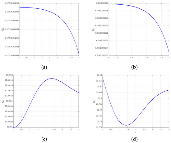 Figure 4. Quantities Q 1 (a), Q 2 (b), Q 3 (c) and Q 4 (d) under mesh steps h = 1 / 8 , τ F = 1 / 64 .