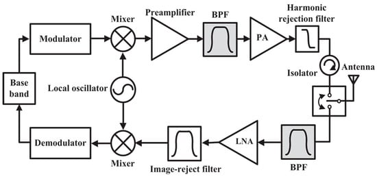 The role of a bandpass filter in a communication system, as given below in Figure 1, is essential as it helps select the wanted signal while stopping unwanted signals. In portable terminals, miniaturization of the BPF is critical because BPFs typically occupy a space of 40% of the R.F. circuits. Reducing their size can help improve the device’s overall form factor and usability [,,].