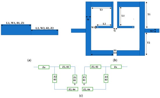 The proposed filter comprises two symmetrical step impedance resonator configurations with one end open-circuited and the other short-circuited, as depicted in Figure 2b. It consists of high/low impedances with characteristic impedances Z2/Z1 and electrical lengths θ2/θ1, respectively, as shown in Figure 2a. W1, L1 and W2, L2 are the physical widths and lengths of the low and high impedances. The low impedance sections are attached with 50-ohm input/output ports of the filter, and the high impedance sections are parallel coupled with metallic via at the lower corner having a radius of 0.25 mm. The first two passbands are obtained due to the ratio of the two impedances (R = Z2/Z1) of the SIR, and the third passband is obtained due to the L-shaped structure coupled to the high impedance section. The resonators are folded in a compact way to introduce magnetic and electric coupling for the generation of multiple TZs in the passbands. The electric coupling, which is a weak coupling in this case, is observed due to space S1 of the open-circuited stubs of the low-impedance section of the SIR. The magnetic coupling is observed due to gap G1 of the parallel short-circuited high-impedance section of the SIR. The input admittance Yin1 (Yin = 1/Zin) of Figure 2a is calculated as [,];