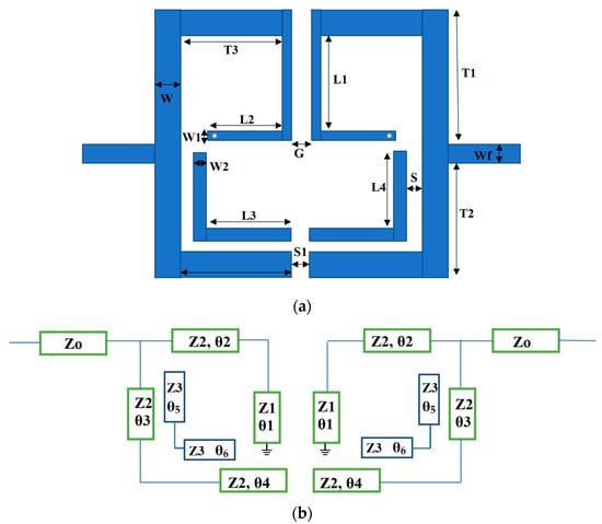 Multiband bandpass filters are crucial in modern and emerging multi-mode wireless communication systems. These filters enable the simultaneous operation of wireless devices in multiple frequency bands, allowing for integrating previous wireless standards with new ones and supporting the increasing demand for wireless applications, including 5G and IoT []. The characteristics of low loss, sharp selectivity, compact size, and high inter-band isolation make multiband bandpass filters highly desirable for modern wireless communication systems. Low-loss filters help minimize signal loss during transmission, while compact size is essential for space-constrained devices [,]. Overall, the demand for multiband bandpass filters will continue to grow in the coming years as the world becomes more wireless and the need for multi-mode wireless communication systems increases [,].