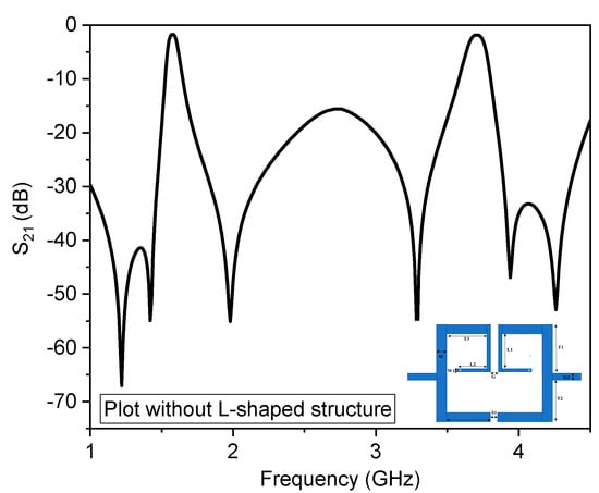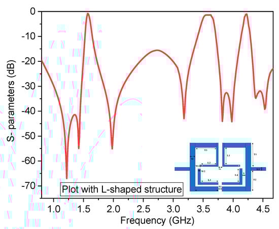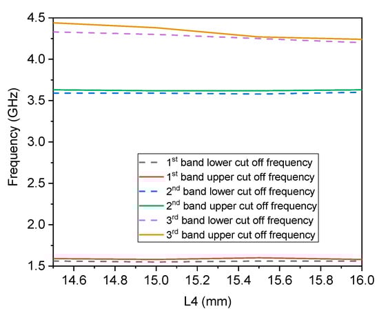 A high selectivity with eight transmission zeros triband bandpass filters is designed in this study. The proposed prototype combines low impedance section Z1 with one end open circuited and high impedance section Z2, which is folded to introduce coupling phenomena and size reduction with metallic via at lower edges. Later, a half-wavelength L-shaped resonator is further utilized for multi-passbands. The first two passbands for the applications of GPS and WiMAX are obtained due to the quarter wavelength step impedance resonator with electrical parameters Z0 = 50 Ω, Z1 = 71 Ω, Z2 = 50 Ω, θ1 = 77, θ2 = 78.94, θ3 = 88.6, and θ4 = 15 and the resonance frequency ratio Kx = f2/f1 which is 2.22 in this case. The electrical lengths of the proposed SIR can be changed to observe the first and second passbands. Consider Figure 4, which shows the variation of the first and second passband for electrical stub lengths θ1, where the upper cutoff frequency of the first band decreases with an increase of stub length θ1 and the upper and lower cutoff frequencies of the second band varied with no effect on third passband. Figure 5 shows that with the increase of electrical stub length θ4, only the lower cutoff frequency of the first passband and upper cutoff frequency of the second passband decreases with no effect on the third passband. This reveals that the first and second passbands are generated with the ratio of impedances and electrical stub lengths of the SIR. The third passband for satellite application is obtained due to the L-shaped structure embedded in the SIR. Thus, a triple band filter with multiple T.Z.s at different locations is obtained with the central frequencies 1.57 GHz, 3.57 GHz, and 4.2 GHz. The simulated results of the proposed prototype with and without the embedded L-shaped structure are illustrated in Figure 6 and Figure 7, where it is observed that the third passband is obtained due to the half-wavelength L-shaped resonator without affecting the first two passbands. Moreover, the third passband is controllable, and by varying the resonator length L4, the upper cut-off frequency is moved downward compared to the lower cut-off frequency without affecting the remaining passband cut-off frequencies, as shown in Figure 8, respectively.