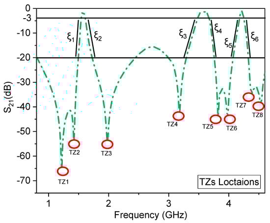 To improve the selectivity of the filter, the structure is folded in a way that it can produce a coupling phenomenon; thus, a total of eight T.Z.s, including 1.22 (TZ1), 1.42 (TZ2), 1.98 (TZ3), 3.18 (TZ4), 3.82 (TZ5), 3.98 (TZ6), 4.38 (TZ7), and 4.53 (TZ8) have been observed between the passbands as shown in Figure 9. Due to these T.Z.s, the roll-off rates (ξ) of the three passbands increased. A higher roll-off rate indicates better selectivity, and it can be defined by regarding −20 dB attenuation and −3 dB attenuation as two cut-off points for the passband. It is equal to the rate of 17 dB with the bandwidth of roll-off []. Thus, the roll-off rates of the three passbands reach up to 294 dB/GHz (ξ1), 170 dB/GHz (ξ2), 106 dB/GHz (ξ3), 242 dB/GHz (ξ4), 106 dB/GHz (ξ5), and 121 dB/GHz (ξ6), respectively. The TZ1 and TZ6 are generated due to the mixed-coupling of the SIR, TZ2 and TZ5 are generated by the SIR itself, TZ3 and TZ4 are produced due to the metallic hole etched to the lower end of the high-impedance section of the SIR, while TZ7 and TZ8 are generated by the embedded L-shaped structure coupled to the low impedance of the SIR, respectively. Moreover, the proposed tri-band BPF has a maximum roll-off rate of up to 294 dB/GHz, demonstrating its great selectivity and abrupt roll-off.