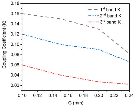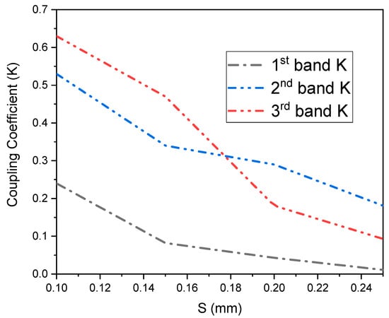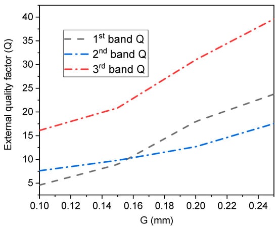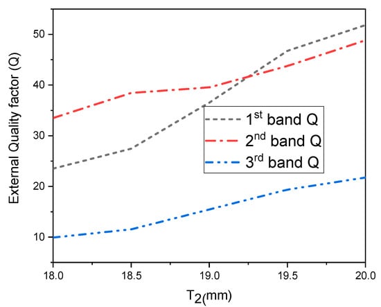 In Figure 3, the parameters G and S are responsible for K, while Q is achieved due to the parameter T2. The coupling coefficient decreases when the values G and S increase while the quality factor increases, as depicted in Figure 10, Figure 11 and Figure 12. Figure 13 shows the response of the three passbands’ quality factors concerning T2. The Q increases with varying values from 18 mm to 20 mm.