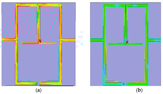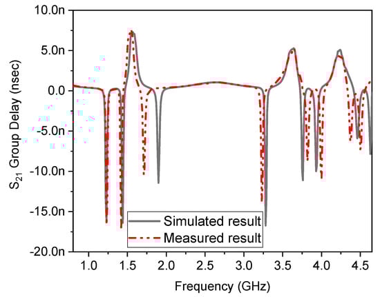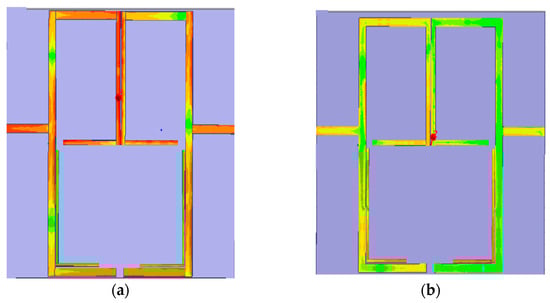 Figure 14 illustrates the group delay of the proposed triband filter. In designing bandpass filters, group delay is a crucial factor since it impacts the filter’s phase response. Group delay is a term that describes the delay that various frequency components of a signal endure as they pass through the filter []. To further validate the working principle, Figure 15 shows the current distribution of the proposed topology at the passbands. The current distribution indicates how the electrical current travels along the filter structure. It contributes to understanding signal propagation and the resonant behaviour of the filter []. As seen in Figure 15a, the current density is maximum on the surface of the SIR at frequency ratio K (f2/f1 = 2.2) because, as discussed, the first two passbands are obtained due to the ratio of the electrical lengths of the SIR. Figure 15b shows the current distribution at 4.23 GHz for the third passband, obtained by the embedded L-shaped resonator. As seen, the current is uniformly distributed only on the surface of the L-shaped resonator. Similarly, the magnitude of the electric field (E) intensity of the passbands is illustrated in Figure 16, respectively.