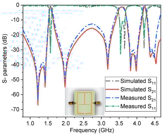 In this article, a compact prototype with three passbands has been designed and fabricated to check the real-time performance. The filter was constructed using a step impedance resonator with metallic slots perturbation to the lower corner of the high impedance section to realise the first two passbands at 1.57 GHz for GPS and 3.5 GHz for WiMAX applications. The SIR was folded to reduce the circuit area, an essential requirement for communication system integration. The third passband at 4.23 GHz for satellite application is obtained using an L-shaped resonator coupled to the low impedance section of the SIR, resulting in a triband operating filter with good selectivity of multiple T.Z.s between the passbands. Eight T.Z.s were observed between the passbands at locations of 1.22/1.42/1.98/3.18/3.82/3.98/4.38/4.53 GHz, respectively. The suggested layout is fabricated on low tangent loss substrate material RO-4350 and tested on a ZNB-20 vector network analyzer. A good simulated and measured frequency plot of S11 and S21 is shown in Figure 17 was obtained. The proposed filter has low signal attenuation of less than 1.2 dB and high signal reflection of better than 25 dB for the three passbands. The fractional bandwidths achieved are 2.54%, 4.2%, and 1.65% at 1.57/3.57/4.23 GHz, respectively, with rejection levels in the stopband greater than 15 dB. The area occupied by the filter on a substrate or in a circuit is 0.31 λeff × 0.24 λeff (0.086 λg2), where λeff is the effective dielectric constant of the material calculated at the lowest frequency. Table 2 listed the comparison of this work with other triband filters in the literature in terms of size, FBW, IL, R.L., and selectivity.