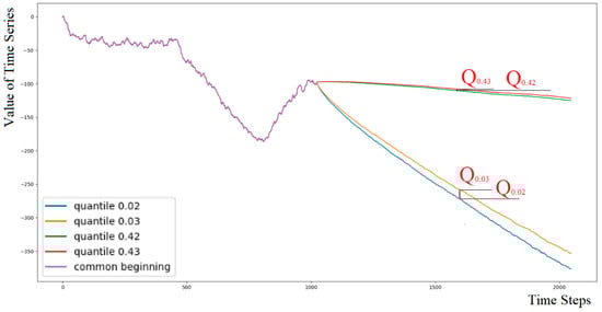 The example created using this method is illustrated in Figure 2. The figure displays a common row for the first 1024 time steps, followed by four colored curves representing the quantiles of the numerous possible continuations of the common beginning.