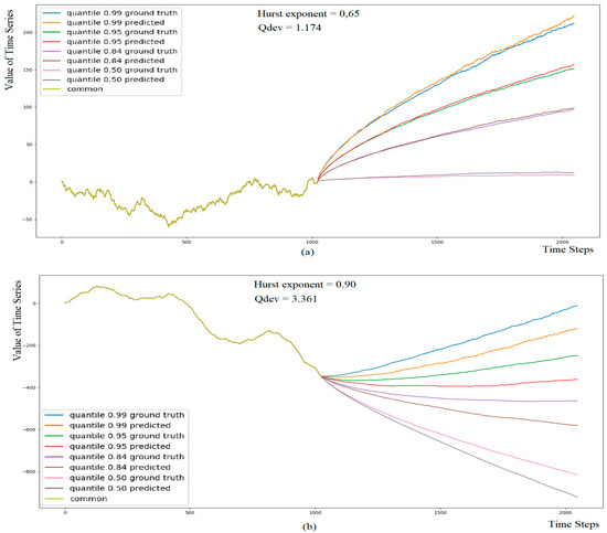 In addition to the requirement that the generated continuations Xc(t) must have the same fractal and statistical properties as the original series X(t), we need to assess the quality of the forecasting. Ideally, for each example, X(t) with its corresponding value of H, the matrix of quantiles of the continuations Qc(αi) should match the true matrix Q(αi) presented in the dataset. As a measure of deviation Qdev, we will use the absolute difference between the true and predicted quantile values at the given time step tj, normalized by the difference between the true value of the quantile Q(αi) and the adjacent Q(αi+1) for each quantile from 0.01 to 0.99 and each time step, averaging it (Figure 3):