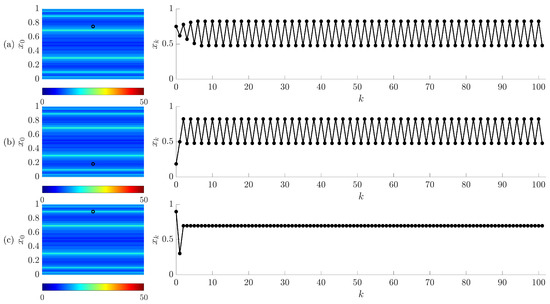 Classical logistic map can exhibit three types of convergence to a fixed point, which are illustrated in Figure 2 for a fixed value of parameter . Note that for this parameter value, two attractors exist: a stable period-2 attractor and an unstable period-1 attractor. Figure 2a depicts asymptotic convergence to a stable period-2 orbit. Selecting the initial condition, corresponding to the center of the low H-rank region, results in the non-asymptotic convergence to the stable period-2 orbit (Figure 2b). Finally, selecting the initial condition, corresponding to the center of the high H-rank region, results in the non-asymptotic convergence to the unstable period-1 orbit (Figure 2c).
