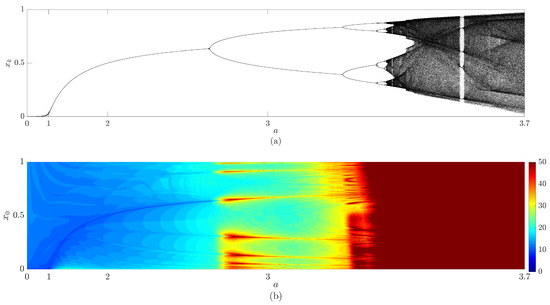 has been shown to possess surprisingly complex dynamics []. H-ranks have been shown to be an effective tool for the study of such dynamics, including the detection of convergence types. The bifurcation diagram of (4) and the plot of H-ranks is depicted in Figure 1. Note that the structure of the bifurcation diagram is fully contained within the plot of H-ranks. Moreover, intertwined manifolds of non-asymptotic convergence are also present in the pattern of H-ranks [].