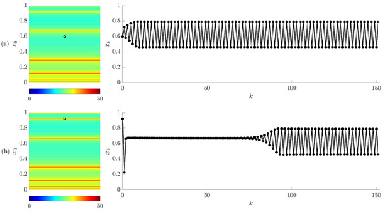 The asymptotic convergence to the asymptotically stable period-2 orbit occurs when the initial condition does not coincide with any of the bright bands in the pattern of H-ranks (Figure 4a). As mentioned previously, the non-asymptotic convergence is not possible for the fractional difference logistic map. However, a short non-asymptotic process yields a finite-time stabilization of the unstable period-1 orbit when the initial condition is set right over the bright band in the pattern of H-ranks (Figure 4b). Note that such finite-time stabilization of unstable orbits of the fractional difference logistic map by choosing an appropriate initial condition is already discussed and investigated in [].
