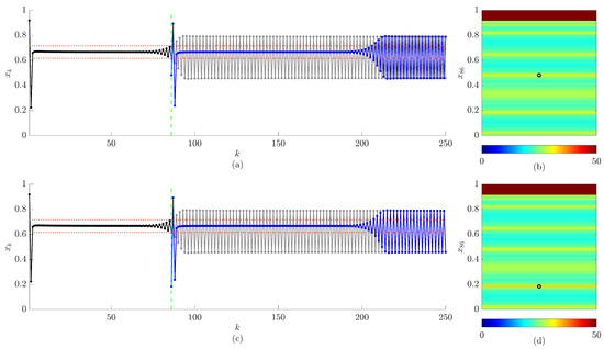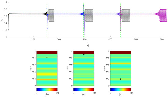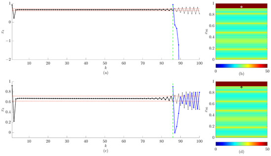 The proper selection of is a key to this control scheme. As demonstrated in Figure 8a,b, the selection of in the wide dark red band of highest possible H-ranks results in a divergent trajectory. Note that this fact does not contradict the boundedness of (1), since this divergence can only occur after the control impulse. Control impulses alter the memory of the map, making it possible for the divergence to occur.