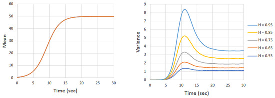 For , , = 0.05, = 0.5, = 0.01, = 0.02, and the solution mean and variance are shown in Figure 2. We can notice that increasing the Hurst parameter will smooth the solution (less oscillations) but at the same time increase the variance. In the case of being relatively small, as in the current case, the mean is not sensitive to the Hurst parameter and hence the stochastic (diffusion) term is small compared to the mean solution.