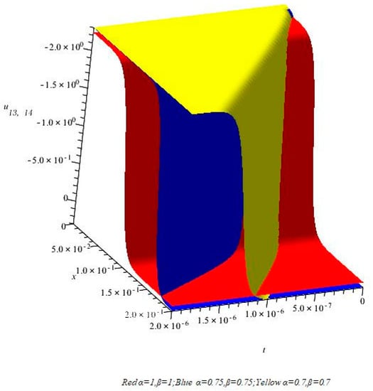 Taking , combined with the material parameters in Formula (26), the three-dimensional numerical simulation diagrams of u13,14 with positive coefficients under different space-time fractal dimensions are drawn, as shown in Figure 1. It can be seen that it is a kink solitary wave. The kink solitary wave rotates with the decrease of the space-time fractal dimension, the waveform is steeper, and the amplitude becomes larger.