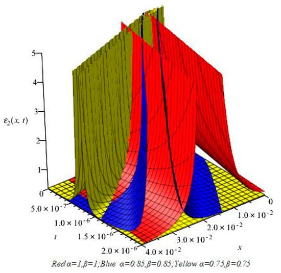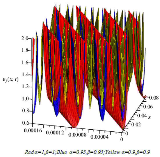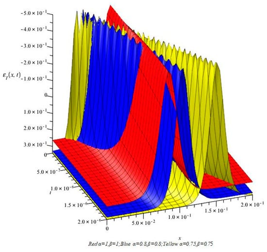 Taking , combined with the material parameters in Formula (26), the three-dimensional numerical simulation diagram of fractal dimension strain wave under different space-time fractal dimensions is drawn, as shown in Figure 5. It can be seen that it is a fractal dimension strain periodic wave. In Figure 5, the red represents the strain periodic wave when the space-time fractal dimension index , the blue represents the strain periodic wave when the space-time fractal dimension index and the yellow represents the strain periodic wave when the space-time fractal dimension index . It can be seen that with the decrease of the space-time fractal dimension, the period of the fractal dimension strain periodic wave becomes smaller, the minimum positive amplitude value increases, the waveform becomes steeper, and the wave width becomes smaller. This means that when the fractal dimension strain periodic wave propagates in the fractal thin rod, the smaller the fractal dimension, the greater the damage to the material and the higher the tensile strength of the material.