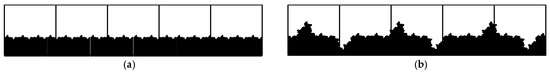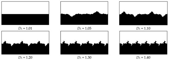 Table 1 shows that as the fractal dimension increases, the length similarity ratio βL gradually increases, and the wall length unit of fractal L-system decreases accordingly. According to the proposed model of wall surface morphology using the fractal L-system, the wall surface morphology under different wall fractal dimensions can be drawn as shown in Figure 3. In addition, only the lower part of the physical model is shown in this schematic diagram. That is, the bottom edge is the roughness wall surface, and the upper part is the flow space of the bulk phase fluid in the microchannel.