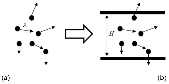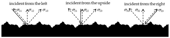 Similarly, according to the direction of reflection of the particles, the direction of the discrete velocity is also finite. In a larger gas flow microchannel, the scattering coefficients in each direction in the closed boundary condition are also determined parameters. However, the pore throat of the tight sandstone gas reservoir is very small, and the irregular wall roughness with a concave–convex morphology occupies a large part of the space of the pore throat. Meanwhile, with the same lattice characteristic length, the surface morphology of the wall is complex, and the reflection angle of the particle collision with the wall surface changes frequently, as shown in Figure 5.