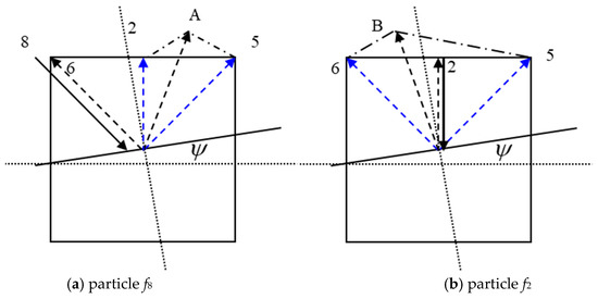 Taking the reflection of particles colliding with the wall in the diagonal direction f8 as an example, after scattering, rb particles bounce back in the f6 direction, and (1 − rb) particles scatter in the direction of A, dispersing into the f2 and f5 directions. In the meantime, rb particles in the f2 direction bounce back along the f2 direction, and (1 − rb) particles scatter in the A direction, dispersing them into f5 and f6 directions. According to these assumptions and methods, by combining Equations (2), (3), (13) and (14), the scattering coefficient matrix is obtained when the length of the wall grid unit is exactly equal to the length of the lattice, as follows: