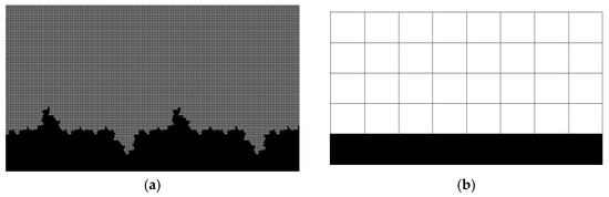 In this case, only the conventional boundary conditions, including wall slip, are used to carry out LBM simulation and calculation. For the coarsened model, the equivalent boundary condition for wall roughness proposed in this paper is used for simulation and calculation. First, we verify the correctness of the rough wall boundary equivalent method proposed in this paper through LBM simulation at the microscale. The model parameters are set as follows. The dynamic viscosity of methane gas is 0.022 mPa • s under actual reservoir conditions. The isotherm temperature of the model system is 383.15 K (i.e., 110 °C). The average pressure of the model system is set to 30 MPa. The average density of gas at the outlet is , and its value is 1.0 g/cm3. The fractal dimension D of the microchannel wall is 1.2, and its characteristic length is 50 × 10−9 m. The effective grid number of the refined LBM model after mesh refinement is 400 × 200. The grid number of equivalent LBM model after roughening the scattering coefficient matrix proposed above is 8 × 4. The bottom edge of the model is set as a closed boundary, and the upper edge is set as an open boundary. The inlet and outlet of the model are set at the condition of constant pressure, and the displacement pressure gradient is 0.6 MPa/×10−2 m. The schematic diagram of the above two models and microchannel structure is shown in Figure 8.