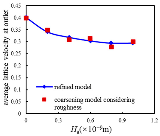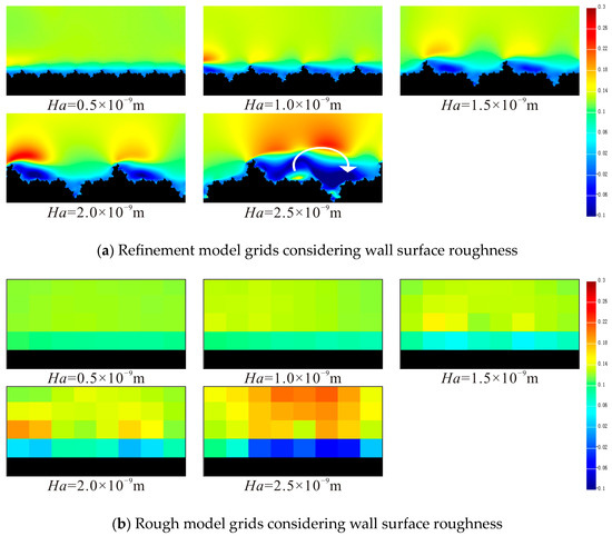 Using LBM simulation, the transverse lattice velocity field distribution of gas particles in the actual rough boundary refinement grid model and the coarser grid model with equivalent boundary conditions are compared and analyzed. The fractal dimension D of the microchannel wall is set to 1.20, and the average height Ha of the rock wall surface is set at 1% to 5% of the characteristic length of the flow field, namely 0.5, 1.0, 1.5, 2.0, and 2.5 × 10−9 m. The transverse lattice velocity field obtained by the simulation under two boundary conditions is shown in Figure 9.