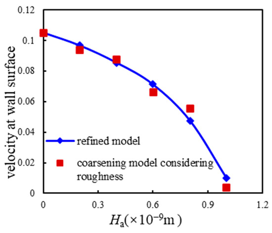 Comparing the simulation results in relation to the two wall boundary conditions above shows that the gas migration velocity distribution in the transverse direction and its variation law are basically consistent, whether obtained by the fine model of actual boundary conditions or the equivalent coarse-grid model taking into account wall surface roughness. This verifies the accuracy of the equivalent boundary conditions proposed in this paper. The transverse velocity field of gas particle flow under different average wall heights is shown in Figure 8. Where the characteristic size of the flow field and the fractal dimension of the wall surface remain unchanged, with the increase in the average height Ha of the concave and convex wall of the microchannel, roughness produces higher resistance to gas particle flow on the wall, and the flow law of the gas particles changes accordingly. The larger Ha is, the greater the differences in gas particle flow velocity between adjacent positions on the surface of the rock wall. When Ha exceeds 1.0 × 10−9 m, that is, when relative roughness exceeds 2%, vortex backflow gradually occurs near the wall surface, and the local flow velocity becomes negative, resulting in a great disturbance to the distribution of the velocity field of the gas particle flow. When the Ha value is 2.5 × 10−9 m, that is, when relative roughness is 5%, a large range of vortex reflux leads to inefficient or ineffective local gas particle flow, which greatly reduces the flow capacity and flow rate of gas particles in the microchannel. The pore-throat structure of tight sandstone porous media is complex, and frequent changes in rock wall surface height increases the seepage resistance. Once the vortex backflow occurs, the permeability of the reservoir is greatly reduced.